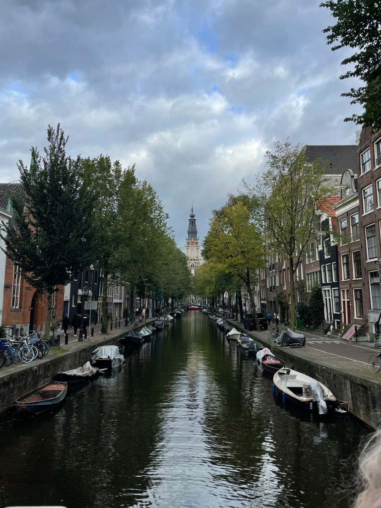 Walking the canals of Amsterdam was one of the most pleasant experiences in my life. I felt the brisk air hit my face and could visualize my nose growing pinker with every gust of wind that hit me. I was huddled in a slick black leather jacket with my hands in my pockets and my feet walking at a faster pace than normal. My eyes were not focused on the people walking at me, but on the water to my right. I could see the green moss growing up the sides of the brick and the calm water reflecting the 17th century merchant buildings. Every now and then a boat with huddled up passengers would pass by and cause ripples across the canal which would break the reflection only for a short while. The trees that lined the water had leaves changing colours and becoming bare with every wind current that would hit them. Leaves were falling in by my face and upon my head, but I did not mind one bit.